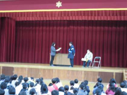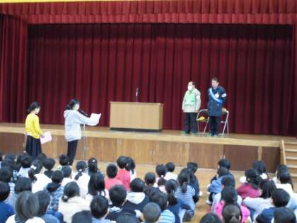 3月7日(木)8時半から体育館で「感謝のつどい]がありました。日頃大変お世話になっている「朱七交通安全協議会」「朱五交通安全対策協議会」「西院朱雀まちかど駐輪場」「京都市行財政局サービス事業推進室」方に校長先生から感謝状が贈られました。「朱五交通安全対策協議会」と「京都市行財政局サービス事業推進室」の方に壇上で感謝状を受け取っていただき,お言葉をいただきました。続いて,6年生の代表児童2人から,お礼の言葉を述べました。