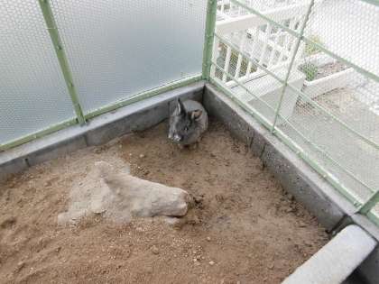 ウサギ小屋の整備のために職員室前のゲージで暮らしていたバニラですが,塗装の匂いもなくなってきたので,リニューアルされたウサギ小屋に戻りました。生き物大好き委員会のメンバーが砂を入れてくれた砂場にさっそく穴を掘って,居場所作りをしていました。広いところに戻れて喜んでいることと思います。