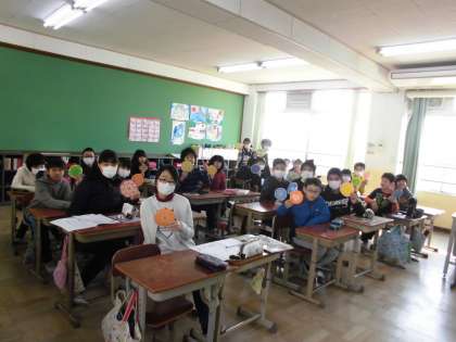3月15日(金)なないろタイムの時間に6年2組にお礼のメダルを届けに行きました。切り紙を画用紙に貼ってラミネートして作りました。1人1人の首にかけてあげたり,手渡したりしました。担任の先生にもプレゼントしました。