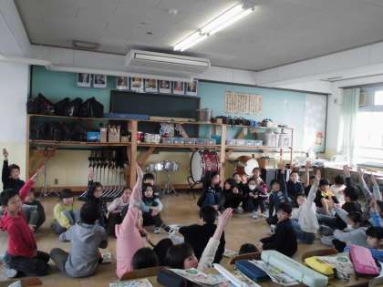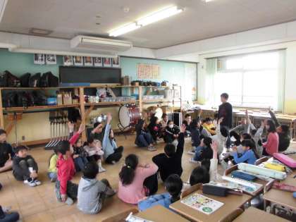4年生は最後の音楽の授業で「茶色の小びん」の合奏を行いました。各クラス,2つのグループに分かれて演奏です。自分達で楽器を選び,どんな曲で表現するのかを考えて演奏しました。発表本番は緊張した様子でしたが,どのグループもがんばって行う姿が見られました。
