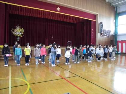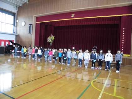 管理職離任式,離任式,管理職着任式を終えた後,1年生は入学式の「お祝いの言葉」の練習をしました。4月8日の入学式では,2年生としてお迎えの言葉と鈴や鍵盤ハーモニカの演奏をします。お手玉やけん玉を披露してくれる人もいます。今日が最後の練習となり,4月8日(月)は本番です。力が十分に発揮できるように祈っています。
