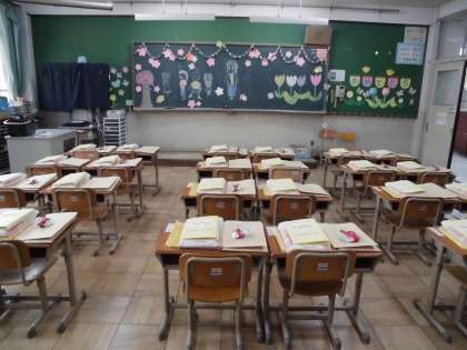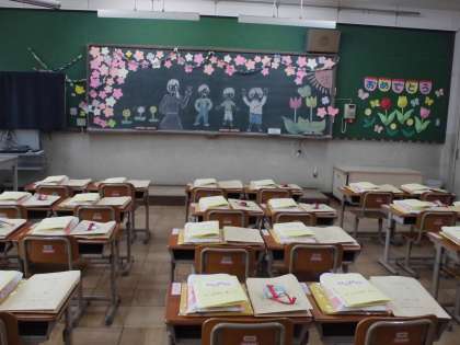 4月8日は,入学式です。今日は教職員で入学式の準備を行いました。黒板には,離任式の日に5年生が準備をしてくれた飾りや絵があります。机の上には,新しい教科書や入学式の日に持ち帰る物が準備されています。