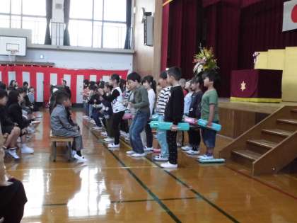 今日は入学式でした。入学式の最後には新2年生が,「お迎えの言葉」を送りました。まず,席から鍵盤ハーモニカで「こいぬのマーチ」を演奏しながら舞台下まで歩きます。整列すると,お祝いの言葉を順に発表していきました。「むかしあそび」の学習の紹介では,「うさぎとかめ」の歌に合わせて.けん玉とお手玉を披露しました。そして入学をお祝いして「きらきらぼし」を鍵盤ハーモニカと鈴で演奏しました。