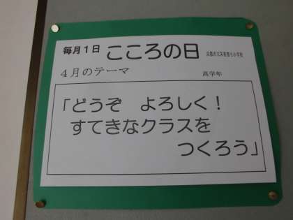 4月のこころの日のテーマは,全学年共通「どうぞ よろしく! すてきなクラスをつくろう」です。各学年の学年目標や各クラスのクラス目標が決まってきていると思います。それぞれ自分の学年でこの1年どんなふうに学習し,活動していきたいか。どんな自分になりたいか,考えてみてください。