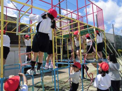2時間目の体育では,遊具の使い方を学習しました。手と足を使って必ず3点以上で身体を支えることや,親指を回してぐっとつかむことなど,確認しながら安全に遊びました。