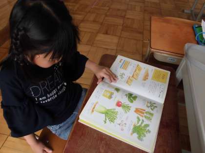 3組の畑で育てる作物について,考えました。図書室でいろいろな本を借りてきて調べました。「食べられるものを育てたい」ということで,野菜から選ぶことにしました。今から育てられるもので,苦手でない野菜を見ていきました。