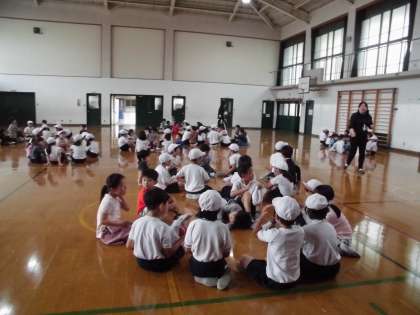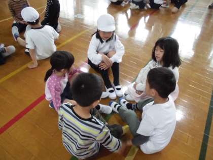 「かもつれっしゃ」のあとは,「もうじゅうがり」をしました。これも,はじめにルール説明や見本を見て,みんなでしました。先生が言った動物の文字数,「ぞう」なら2人,「らいおん」なら4人のグループを作って座ります。みんな,とても楽しく活動していました。