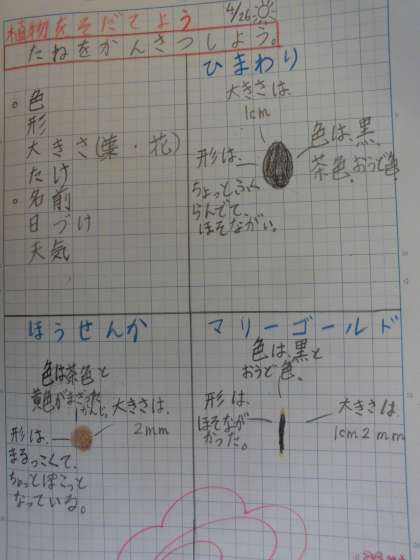 理科では,「植物をそだてよう」の学習をしています。ゴールデンウイーク前に,これから育てていくひまわり・ほうせんか・マリーゴールドの種を細かく観察しました。3つの植物の大きさも形も色も全く違うことにびっくりの子ども達でした。さらに,種の様子も違えば,まき方も違うことをみんなで確認し,今日,畑やプランターに種をまきました。「大きくなあれ!」おまじないをかける子もいました。いつごろに,芽が出るのか,みんなで予想を立てています。その結果を楽しみにしたいと思います。