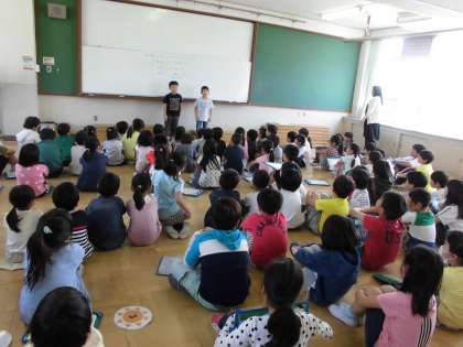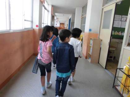 5月10日(金)1時間目と2時間目は,生活科の学習「校内たんけん」でした。2年生は,1年生を案内するために準備してきました。今日は朝から少しドキドキしていました。朱七ホールに集まり,2年生のはじめのことば,先生のお話の後,1組はお星さまグループ,2組はお日さまグループのわくわくグループに分かれて,校内を案内しました。