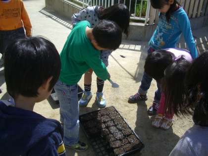 2年生が楽しそうに活動しています。トマトの種蒔きです。ポットに土を入れ,先生からもらった,たった一つの小さな種を大切に蒔いています。「トマトの実ができたら,ひとつくれる?」「え〜〜。」