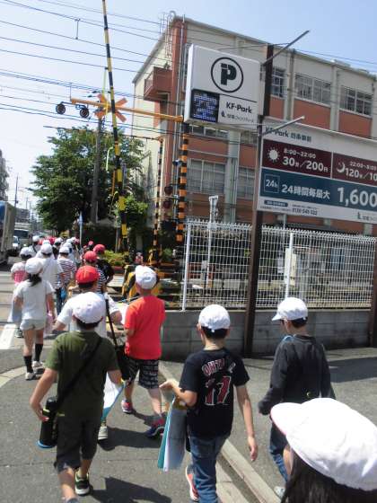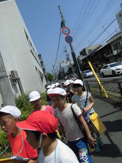 社会科の学習で校区探検へ行きました。北コースと南コースの2回に分けて校区の様子を見てきました。まず,普段歩き慣れ親しんでいる御前通りと四条通りの様子の違いを早速見つけました。他にも,意外な発見もあったようで,「学校の周りはお店が多いんだ」と,まちの特徴を考えている子もいました。探検したことを地図にまとめながら,さらに朱七のまちの特徴を見つけていきたいと思います。
