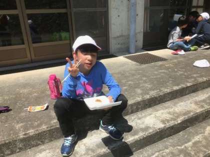 スコアオリエンテーリングの山から帰ってきました。戻ったグループからお昼ご飯です。しんどかったけど,楽しそうに帰って来ました。