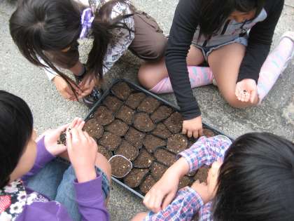 さて,第1回目の活動は・・・みどりクラブの代名詞とも言える「緑のカーテン」となるアサガオの種まきです。黒ポットに土を入れ,そこにアサガオの黒い小さな粒を3つ,そっとおきます。今日は参加した子どもたちが多かったので,400以上のポットが見る間に出来上がりました。最後に,今年も素敵な緑のカーテンが私たちの目を楽しませてくれることを願いながら,たっぷりと水をやりました。