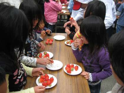 実は昨年11月,おやじ7の活動で苺の苗を植えました。そして,今日それを採り入れてみんなで食べる計画でしたが,残念ながらこの寒さで苺が思うように育たず,急遽買ってきた苺を食べることになったのです。おやじ7の方が泡立ててくださったホイップクリームをつけて苺をほおばる子どもたち。