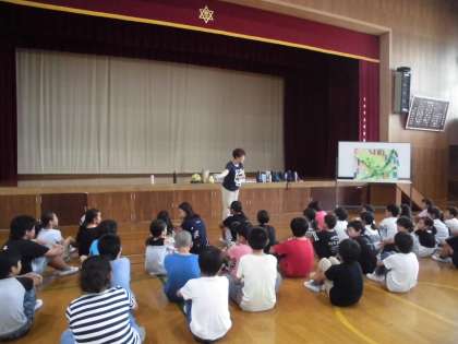 7月5日(金)5時間目に体育館でおこなわれた5年1組と3年2組の「七夕パーティー」に呼んでいただきました。招待してもらったときに5年生にもらった短冊を書いて,3年2組の教室に貼りにいっていました。体育館には,5年1組の手作り笹飾りが掲示してありました。3組のお願い事は,「1りんしゃにのれますように」でした。はじめの言葉の後,最初のゲームは,「猛獣狩り」でした。
