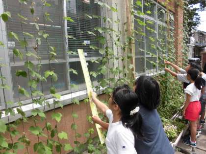 理科の学習で,ツルレイシ,アサガオの1日ののびを調べました。毎朝つるの先の近くに印の札を札をつけて,何cmのびたかを測りました。気温が高くなると植物は大きく成長することが分かりました。