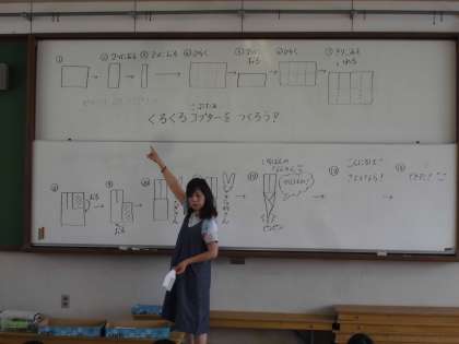 25日(木)は,10時から1・2年の造形教室が,朱七ホールでありました。紙1枚で簡単に作れて,飛ばすとくるくるときれいに回る「くるくるこぷたー」を作りました。ホワイトボードに作り方のイラストを描いてくださっていて,丁寧に教えていただきました。