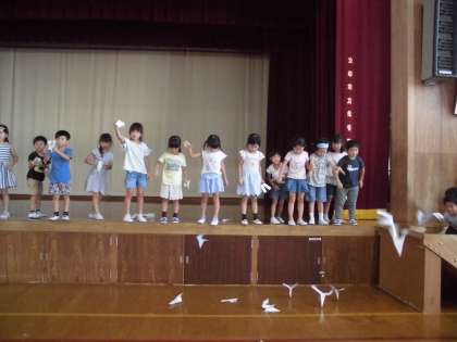 体育館に移動して,出来あがったくるくるコプターで遊びました。舞台の上から飛ばすときれいに回っていました。また,ペアになって友達が投げたくるくるコプターをキャッチする遊び方も教えてもらいました。