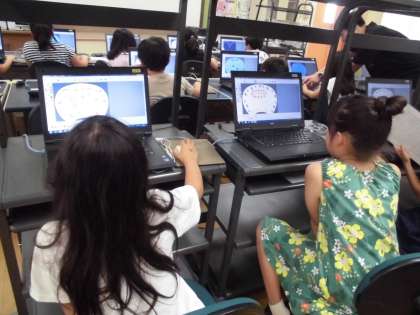 7月29日(月)10時からコンピュータ室で3年のコンピュータ教室がありました。パソコンを使って,好きなイラストや文字をレイアウトして自分だけのうちわを作りました。地の色と文字やイラストの色のコントラストを考えながらデザインしていました。