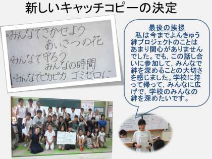 発表が終わると,いよいよ投票の時間です。自分がいいと思うキャッチコピーに投票していきます。そうして,新しいキャッチコピーが決まりました。話し合いの中で,一人一人がしっかり発言する姿が見られました。意見を言う際に,その根拠を示しながら,相手を説得しようと,一生懸命に話す姿がたくさん見られました。いろいろなことを考えて,何が一番いいのかを考えて発言していることが伝わってきました。
