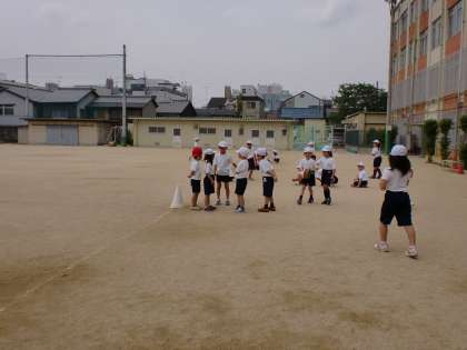 体育の授業でグループに分かれ,リングバトンを使っての折り返しリレーをしています。準備や片付けもみんなで協力して出来ます。今日は,大きな輪をいっぱい飛びました。おもしろかったな!!