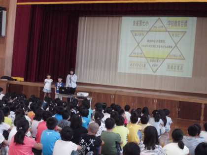 2学期の始業式では,校長先生のお話を聞きました。そのあとには,2学期から朱雀第七小学校で一緒に勉強する転入生の紹介がありました。続いて,テニスの大会でがんばった友達の表彰,テニスの大会に参加したメンバーの紹介,バスケットボールの大会に参加したメンバーの紹介などがありました。