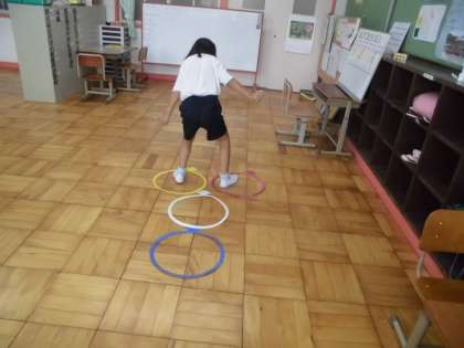 3組の「体の学習」では,ケンステップを使って,「ケンケンパ」の練習をしています。運動会の競技の練習も兼ねています。同じ足で2度跳ぶことや「パッ」と両足同時に着地することなどを練習しています。