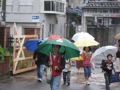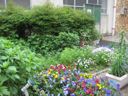 昨日は一気に夏がやってきたかのように暑い日でしたが,今日はむしむしと梅雨のよう,朝から雨になりました。でも,子どもたちがやってくると,学校はなんとなく華やぎます。登校時の玄関前は,傘の花でおおにぎわい。花壇の花たちも生き生きして見えます。体育館では・・・やってる,やってる,駅伝の練習。