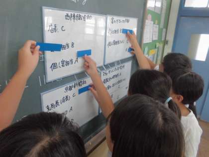 ブース(職業)と役割(職種)を選びました。どのような職業を選ぶのがよいのかや自分が得意なこと,将来してみたい仕事などを考えてから選びました。また,その職業や職種についての思いもノートに書いていました。どの職業,職種も全て大切です。自分の特性を生かしてがんばりましょう。