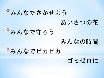 二つ目の工夫は,一つの文章として読むだけではなく,先の文と後の文に分かれて読むことができる事です。たとえば高学年が「みんなでさかせよう」のところを読んで、低学年が「あいさつの花」と返事するという,呼びかけ方式にできるということです。こうすることで,さらに親しみやすくなるというものです。
