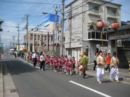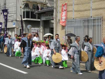 もうそろそろかと待っていると,2時前,遠くの方から笛や太鼓の音が聞こえてきました。梛神社神幸祭の行列です。朱七校の子どがたちもたくさん参加していました。