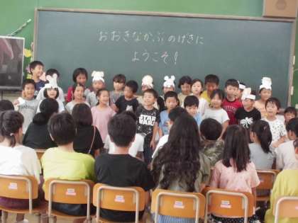 10月4日(金)のスキルタイムに1年生が国語科で学習している「おおきなかぶ」の音読劇発表会がありました。アイビーペア学年の6年生を招待して行われましたが,わくわくグループの1年2組さんから3組も招待していただきました。