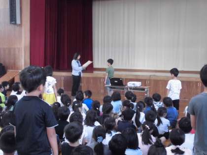 10月1日(火)の朝会では,書写や図工の展覧会で受賞した人の表彰がありました。「京都市小学校児童硬筆書写作品展」「令和元年度小学生作品展 絵画作品・立体作品」「第40回京都市小学生アイデア展」「第42回京都こども美術展」です。佳作や入選の他にも特選や教育長賞,奨励賞などを受賞した作品もありました。それぞれ代表の人が校長先生から賞状を受け取りました。