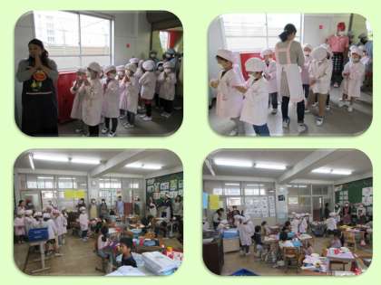 また,1年生の教室に行って,子ども達が配膳する様子も見ていただきました。