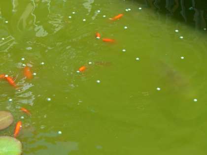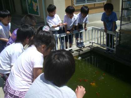 このごろは,子ども達に餌をやってもらっています。70cm程のコイが大きな口をあけてパクッと餌を食べると,みんな大歓声です。また,餌が大きくて食べられない金魚を,やさしく見守っています。