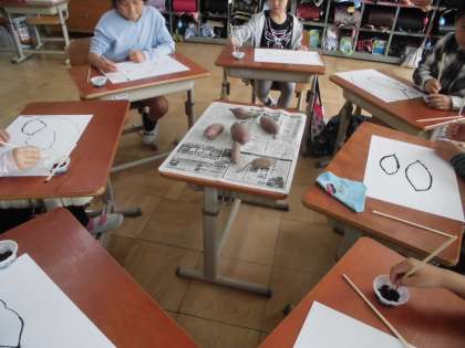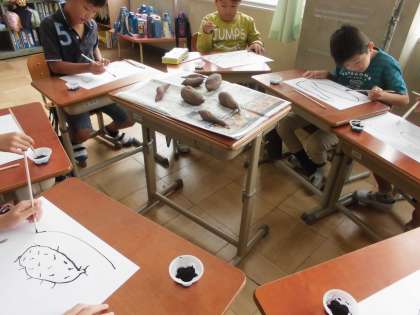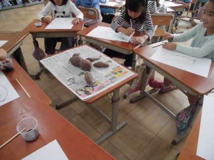 先週の図工では,収穫したサツマイモの絵を描きました。わりばしペンに墨汁を付けてじっくりこまかい部分も観察しながら描きました。わりばしのペンは,スラスラと線が描けない分ゆっくりと線を確かめながら描いていきました。それぞれの個性豊かなサツマイモが描けました。