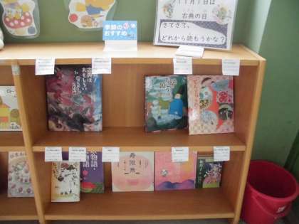 11月1日は,古典の日です。図書館の前に,読みやすい古典の本を展示していただいています。貸出できますので,ゆっくり読んでみてください。そのほかにも紙芝居の横の910日本文学・918古典のたな「絵で見てわかる はじめての古典」,狂言の絵本があります。911詩歌のところには,百人一首・短歌・俳句・川柳があります。図書の掲示板の「11月1日は古典の日 さてさて、どれから読もうかな?」という掲示に詳しく書いてありますので,参考にしてください。