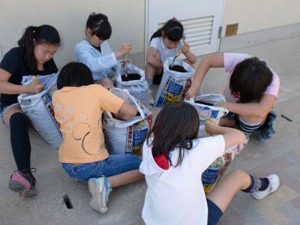 1人1袋の有機培養土で苗を育てます。