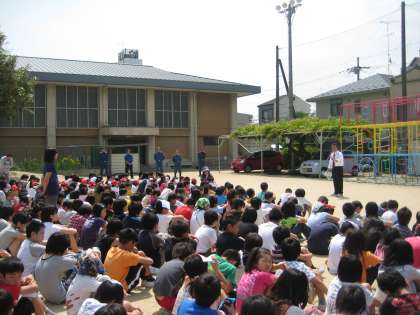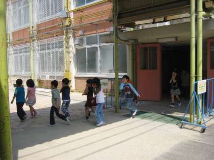 口にハンカチをあて,整然と並んで運動場に出てきた子どもたち,しゃべったりふざけたりしている子は誰もいません。