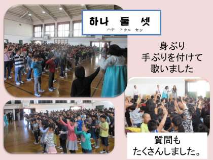 そうして,日本のおとなりの国である,朝鮮半島の国について教えていただきました。楽しい歌遊びをみんなで歌いました。何度も歌ううちに,上手に体を動かしながら歌っている子どもが増えてきました。その後,先生から質問いただいたり,子ども達から先生に質問したりしながら,いろいろと教えていただきました。その中で,日本と似ていることと日本とは違うことを見つけることができました。
