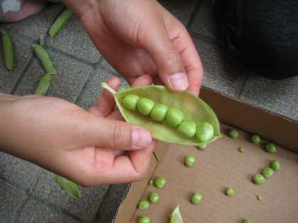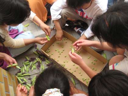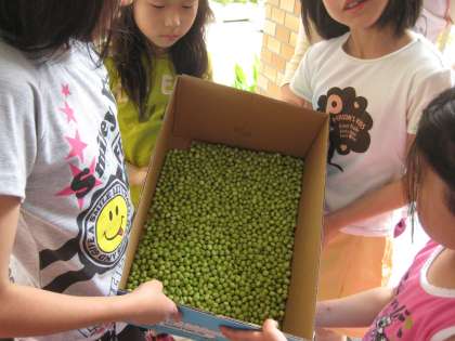 さやをむくと,丸々と太った立派な豆がびっしり詰まっています。これならおいしい豆ご飯ができそうです。多いもので,一つのさやに6つの豆が入っていました。むいた実を全部あわせて重さを量ると2,360グラムもありました。