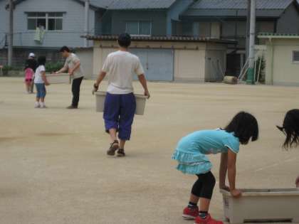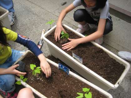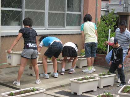 さっき収穫した後のツタンカーメンの蔓を片付け,プランターの土は運動場西の花壇に。重いけど二人で力を合わせて運びます。空になったプランターに土を入れ,第1回目のみどりクラブで種まきをして育てた苗を3本ずつ,植え替えていきました。そのプランターを校舎の窓の下に並べて,今日の活動は終了。これが,緑のカーテンになっていくのです。