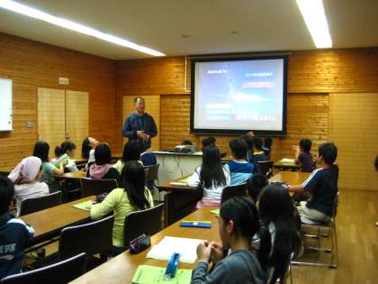 残念ながら天体観測はできません。研修室で星空のDVDを見ることになりました。大きな画面で見る宇宙はとてもきれいでした。でもやっぱり本物の星がよかったなあ。