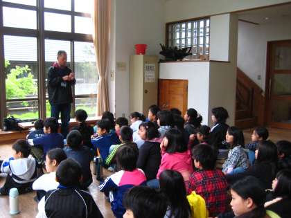 7時からは,参加している4校(唐橋,山階南,室町,朱七)合同の朝のつどいです。雨が降っているので,オリエンテーションホールで行われました。