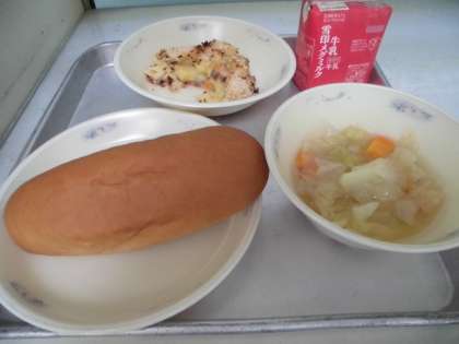 グラタンはフランスで生まれた料理です。オーブンなどで焼き目を付けたもので,具材によってたくさんの種類があります。給食では,ペンネや豆乳で作った手作りルーを使っています。