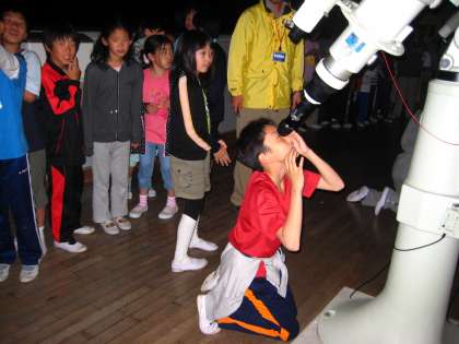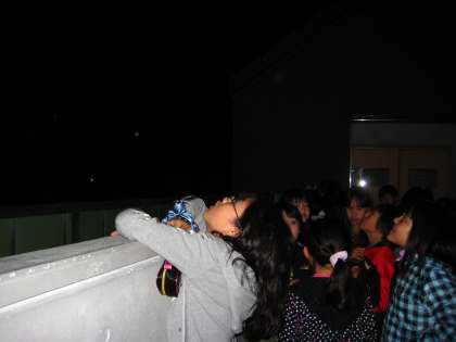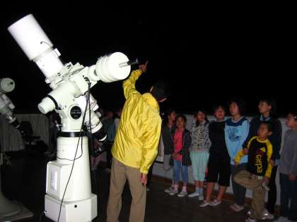 9時前,子どもたちが天体観測所に上がったそのとき,なんとそれまで雲に隠れていた星が見え始めたのです!用意していただいた望遠鏡には,土星がはっきりと。