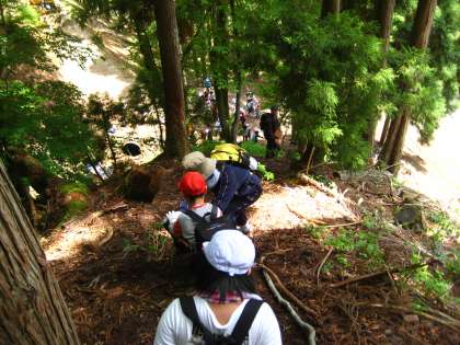 さあ,下山です。登りはしんどかったけど,下りはもっと大変。あまりの急な斜面に足がすくみます。何度も滑り落ちそうになりながら,林道まで降りてきたときには,本当にほっとしました。