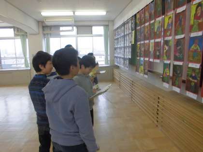 校内版画展の鑑賞をしました。どの学年も工夫をこらし取り組まれており,子ども達はどの学年の作品にも見入っていました。アイビーペアの3年生の作品については,メッセージを書きました。よいところを伝えに行きたいと思っています。