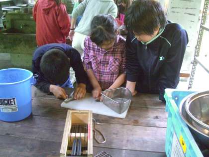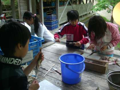 いよいよ,一人一匹の調理です。はじめは,なかなか手が出なく,友達のやっている様子を見ていました。でもそのうちに,キャーもギャーもなく,内臓を引っ張り出し,調理ができました。みんなの力が,一人一匹の調理につながりました。