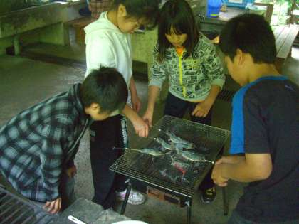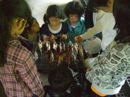 串に刺されたイワナが,網の上に並んでいます。いいにおいがしてきました。どんな味でしょう。